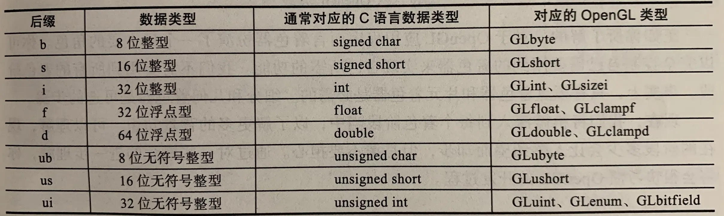 与函数命名约定类似,OpenGL 库中定义的常量采用“GL_”开头,通过#define来完成常量的定义。为了方便在不同的操作系统之间移植 OpenGL 程序,OpenGL 还为函数定义了不同的数据类型,如GLfloat,所以最好统一使用 OpenGL 定义的数据类型,这样就不需要关心系统兼容性问题了。