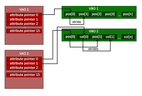顶点数组对象:Vertex Array Object,VAO. 可以像顶点缓冲对象那样被绑定,任何随后的顶点属性调用都会储存在这个 VAO 中。这样的好处就是,当配置顶点属性指针时,你只需要将那些调用执行一次,之后再绘制物体的时候只需要绑定相应的 VAO 就行了。这使在不同顶点数据和属性配置之间切换变得非常简单。