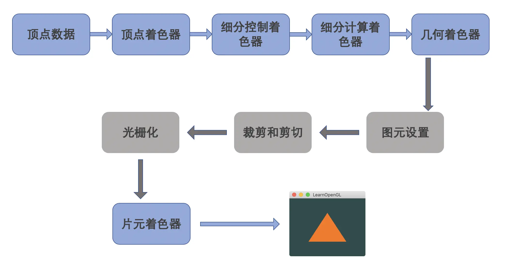 我们可以通过控制我们需要的着色器来实现自己所需的功能,事实上,只有顶点着色器和片元着色器是必需的,细分和几何是可选的步骤。为了更好理解顶点着色器和片元着色器的分工和区别,可以总结为:顶点着色(包括细分和几何着色)决定了一个图元应该位于屏幕的什么位置,而片元着色使用这些信息来决定某个片元的颜色应该是什么。