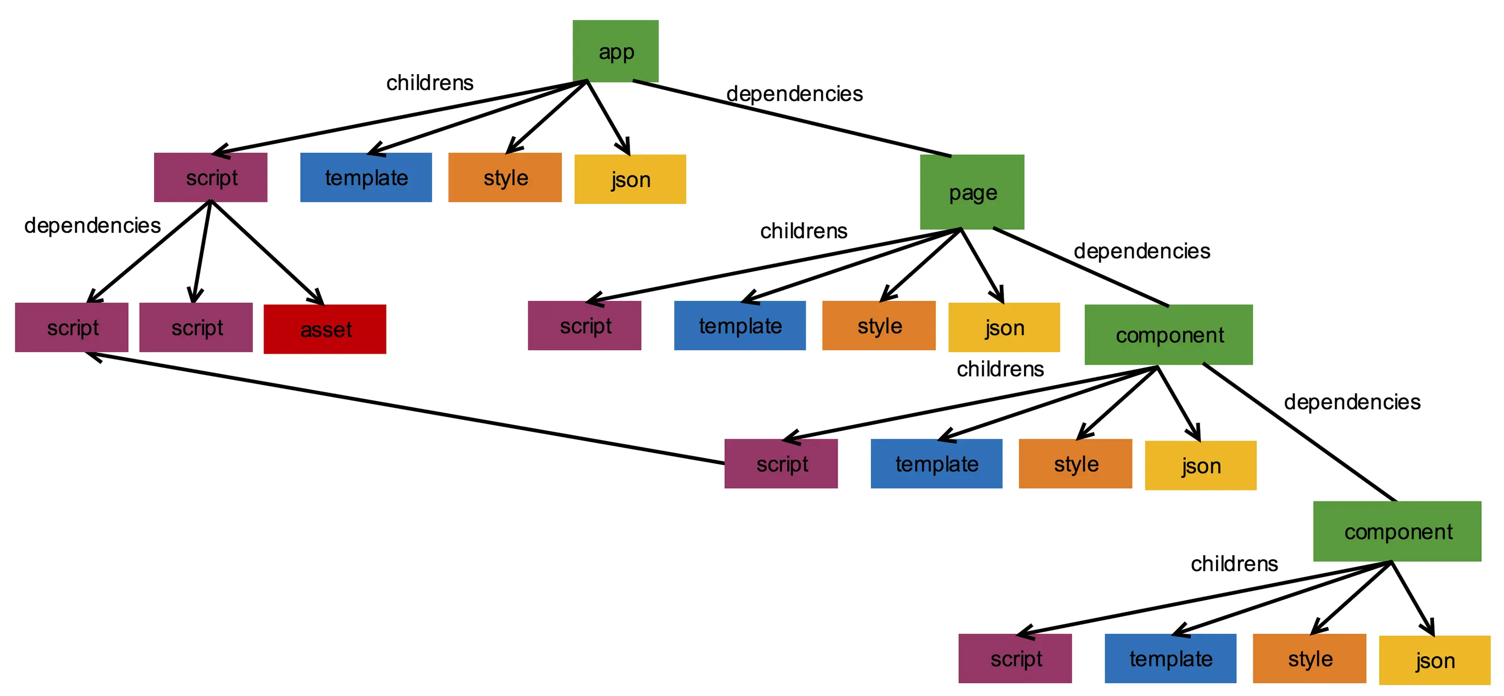chameleon 内部会将整个项目文件编译为如下编译图结构,节点中的内容经过了标准编译,比如script节点的babel处理,style节点的less与stylus处理等等。
