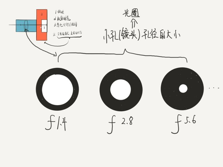 在刚才的模型,盒子上的孔径大小可以改变,而光圈就是开孔孔径的控制。孔径越大,进光量越大,画面越亮;孔径越小,进光量越小,画面越暗。