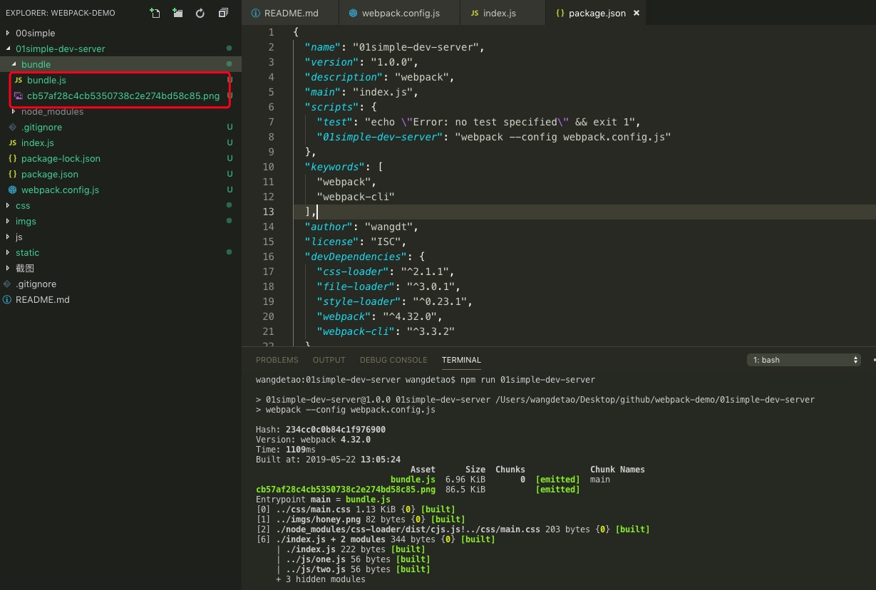 接着在package.json增加 "01simple-dev-server": "webpack --config webpack.config.js" 执行 npm run 01simple-dev-server,我们发现bundle下面多了一张图片,如下