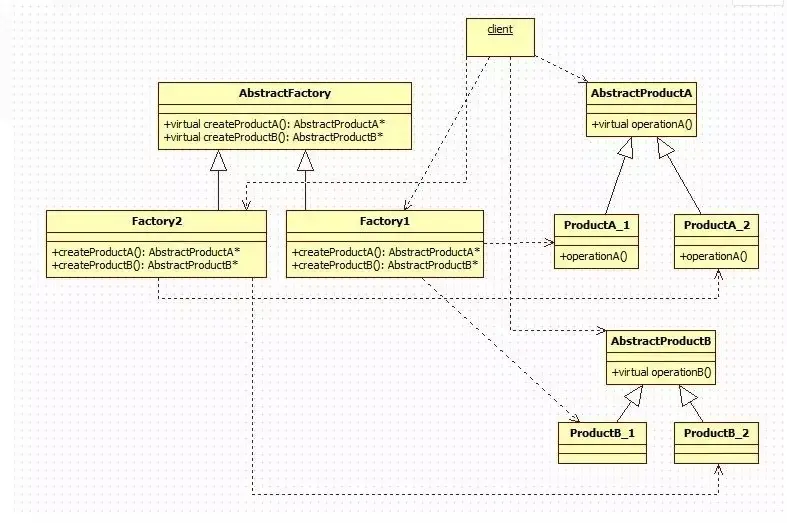 此时,客户端要使用时必须知道是哪一个工厂并且是哪一组的产品抽象类。每一个工厂子类负责产生一族产品,而子类的一种方法产生一种类型的产品。在客户端看来只有AbstractProductA和AbstractProductB两种产品,使用的时候也是直接使用这两种产品。而通过工厂来识别是属于哪一族产品