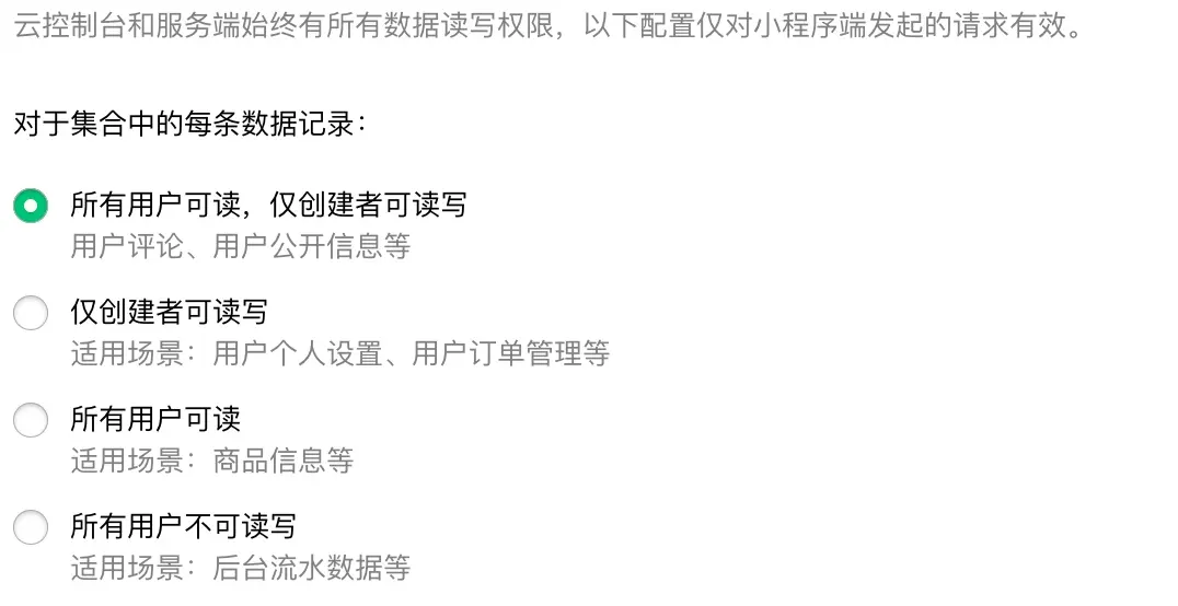 例如有这么一个需求:甲发送了一篇文章,除了所有用户可以查看之外,她的女朋友乙可以删除或者修改这篇文章的内容,这就涉及到修改其他人创建的数据,这个时候上图中云数据库的权限是完全不够用的。但是在云函数中可以实现上述功能。