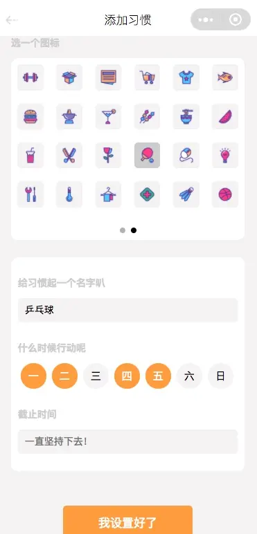 可以为习惯选择图标,设置名称, 设置每周什么时候打卡,下方可以选择截至时间。