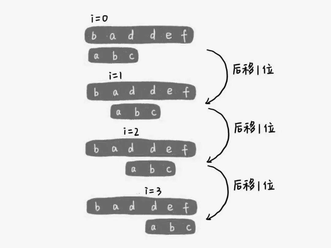 是哒,这就是最常规的思路,也是最简单的算法,这个暴力匹配算法被称作 BF (bure force) 算法。