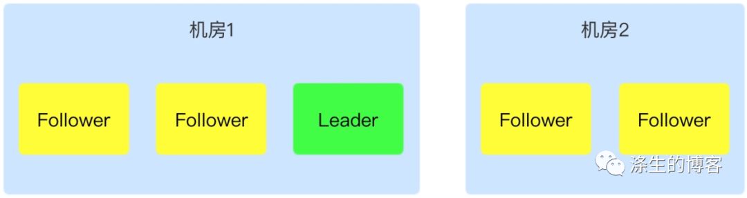 我们先看下单机房部署情况下,下图是单个机房 5 个节点的部署情况。在单机房部署的情况下是不能做到机房容灾的,一旦机房出现问题,整个 Zookeeper 集群就不能对外工作。 单机房部署还需考虑所选的节点应该尽量不在同一个宿主机,不同机柜,避免多个节点同时出现问题。