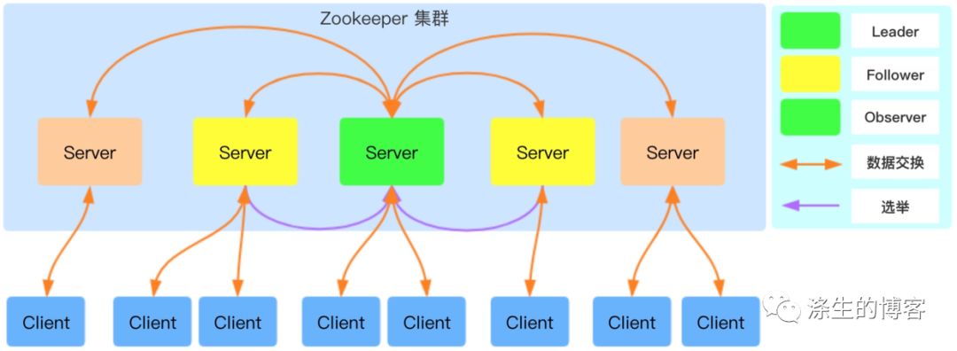 Observer:可以接受客户端连接,接受读写请求,写请求转发给 Leader,但 Observer 不参加投票过程,只同步 Leader 的状态,Observer 的目的是为了扩展系统,提高读取速度。