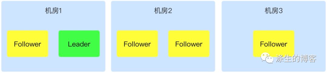 我们再来看看三机房部署,三机房部署,是能够做到机房容灾的。还是以 5 个节点的集群为例: 如下图,在“机房 1”、“机房 2”同时部署 2 个节点,而“机房 3” 部署 1 个节点。在任意一个机房故障的情况下,都能满足正常节点数大于半数及以上,所以能够保证机房容灾。