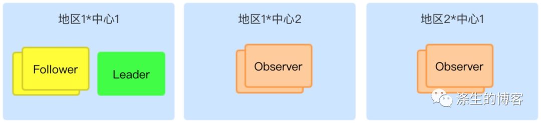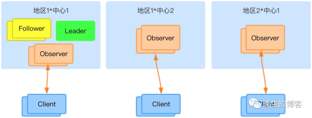 为了保护集群,在三个中心都部署上 Observer 节点,而 Client 只与 Observer 机点进行交互,用这种方式可以降低投票节点的工作负载,降低 Leader 和 Follower 的不稳定性,从而提高整个集群的稳定性和可用性。
