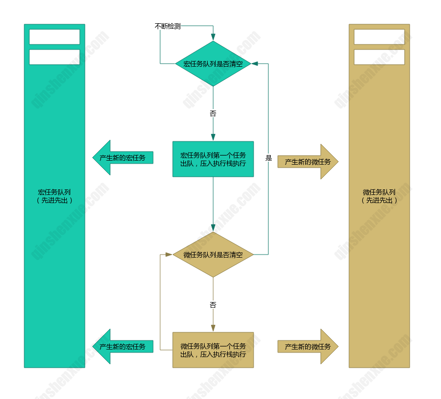 注意: 宏任务执行完后,需要清空当前微任务队列后才回去执行下一个宏任务,如果微任务里面产生了新的微任务,仍然会在当前事件循环里面被执行完,后面会举例说明。