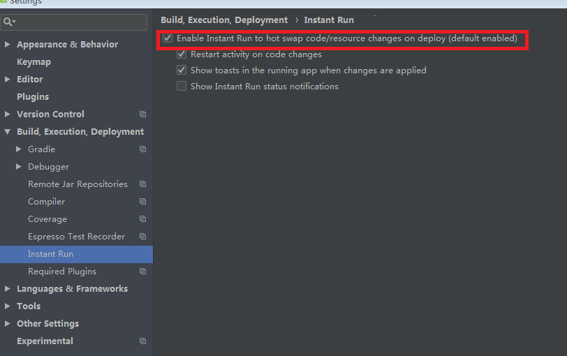 查阅了资料,需要关闭Instant run 如下图,把红色框内的勾去掉就好。