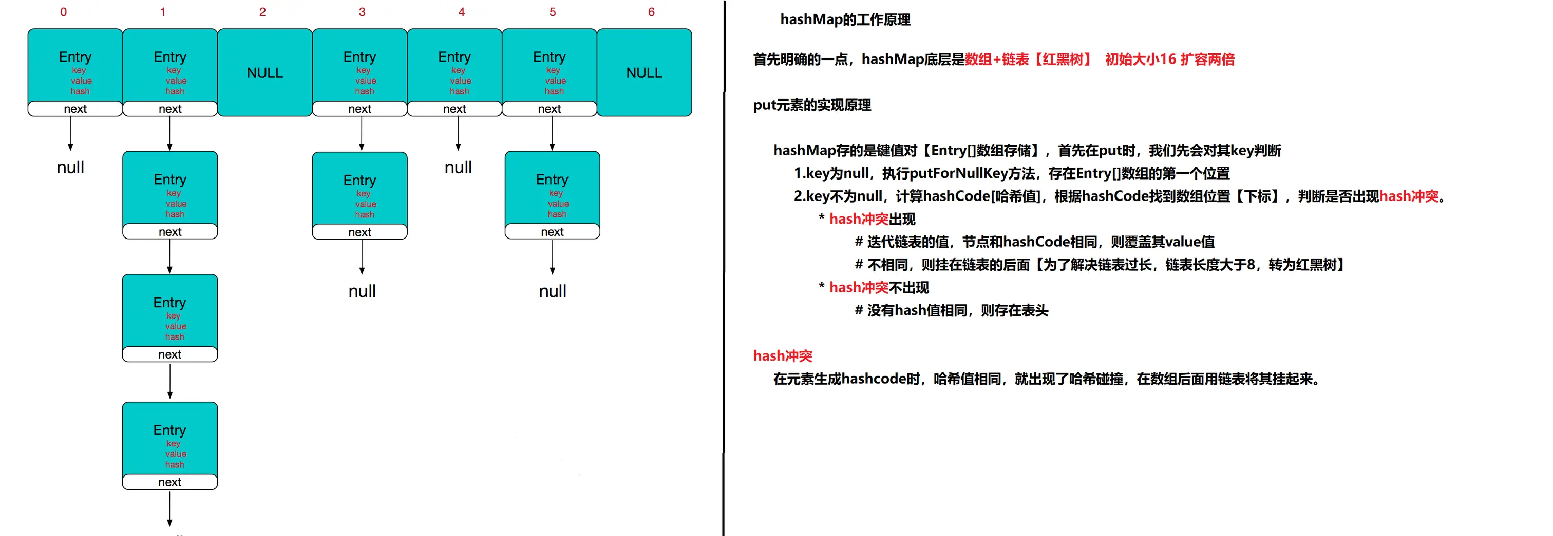 HashMap 基于 Hash 算法实现的,我们通过 put(key,value)存储,get(key)来获取。当传入 key 时,HashMap 会根据 key. hashCode() 计算出 hash 值,根据 hash 值将 value 保存在 bucket 里。当计算出的 hash 值相同时,我们称之为 hash 冲突,HashMap 的做法是用链表和红黑树存储相同 hash 值的 value。