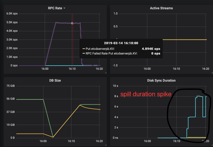 如下etcd监控图当etcd数据量在50GB左右时,spill 操作延时激增到了8s