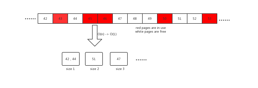 红色的page 43, 45, 46, 50 页面正在被使用,而page 42, 44, 47, 48, 49, 51 是空闲的,可供后续使用。