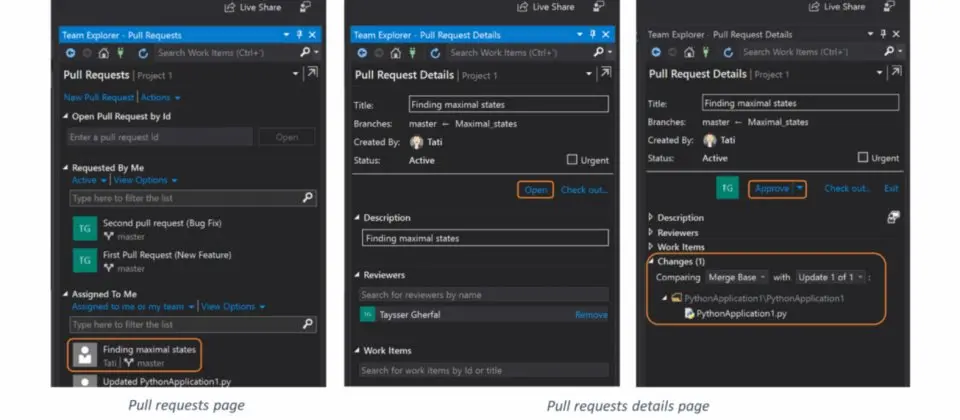 扩充套件的拉取请求页面会整合显示用户创建的拉取请求,以及被指定分配的拉取请求,点开拉取请求就能进行基本操作,像是查看程序代码更改、留下评论,或是批准拉取请求,而拉取请求的详细信息页面,能提供拉取请求描述与团队的讨论,也能查看程序代码变更以及之前的评论。用户可以在想要评论的程序代码点击鼠标右键,就能从选单中选取增加评论选项,开始给予撰写评论,评论格式支持Markdown语法以及图释,也能引用臭虫、团队成员以及其他评论需要的内容,而当评论被解决了,也能标记并通知评论作者。这个套件提供了特别的拉取请求程序代码比较工具,使用者可以随时查看自己对程序代码的修改。目前这个拉取请求扩充套件仍然在实验性阶段,想要尝鲜的使用者,可以在Visual Studio市集中下载。