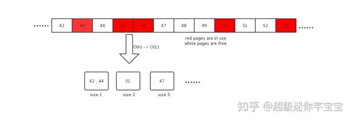 }新的算法借鉴了内存管理中的segregated freelist的算法,它也使用在tcmalloc中。它将page分配时间复杂度由O(n)降为O(1), 释放从O(nlgn)降为O(1),优化效果非常明显。