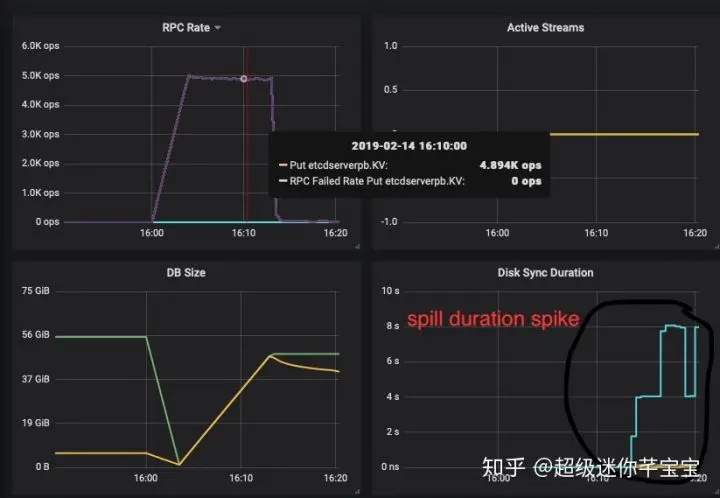 如下etcd监控图当etcd数据量在50GB左右时,spill 操作延时激增到了8s