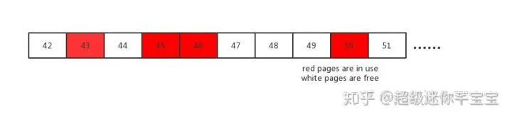 红色的page 43, 45, 46, 50 页面正在被使用,而page 42, 44, 47, 48, 49, 51 是空闲的,可供后续使用。
