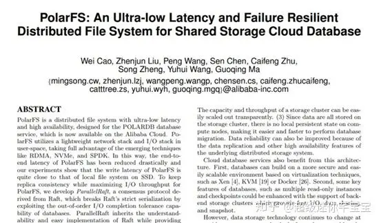 阿里云方面表示,该产品实现了两大技术突破:通过自研超低延迟文件系统PolarFS大幅降低数据跨网络的延迟,并且开发了一种全新的共识协议ParallelRaft,提升系统吞吐量。在此之前,PolarFS的研究成果已发表在数据库顶级会议 VLDB 2018 《PolarFS: An Ultra-low Latency and Failure Resilient Distributed File System for Shared Storage Cloud Database》。