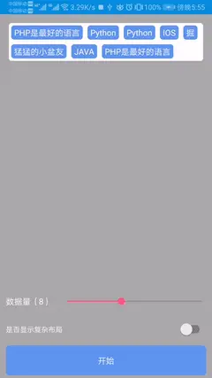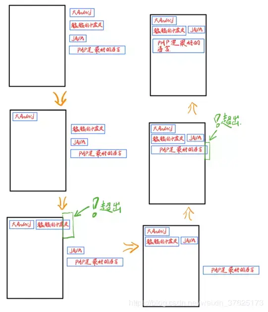 最后把剩下的 “PHP是最好的语言” 也放入,当此时有个问题,即使一行放一个也容不下(第五幅小图),因为 “ PHP是最好的语言” 的宽已经超出 TagFlowLayout 的宽,所以我们在给 “PHP是最好的语言” 测量的MeasureSpec时,需要进行“纠正”,使其宽度为 TagFlowLayout 的宽,最终形成了第六幅小图的样子。