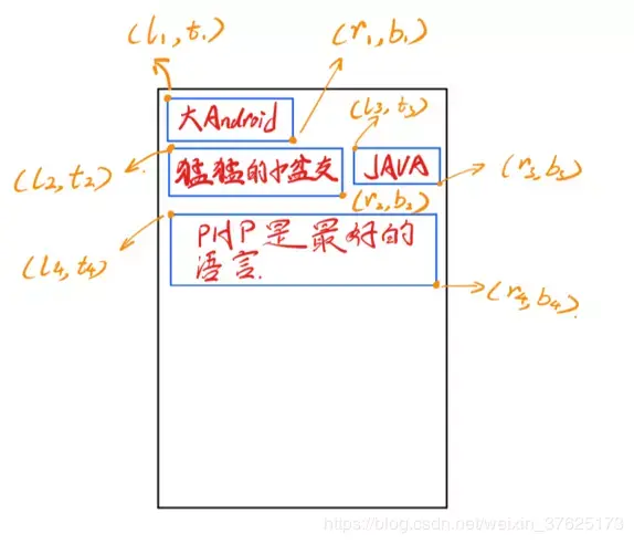 “JAVA” 的坐标则需要依赖“猛猛的小盆友” 和 “大Android”, (l3,t3) 为 (“猛猛的小盆友”的Width, 第一行的高度) ,(r3,b3) 为 (“猛猛的小盆友”的Width + 自身的Width, 第一行的高度+自身的Height)。