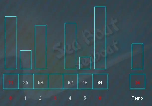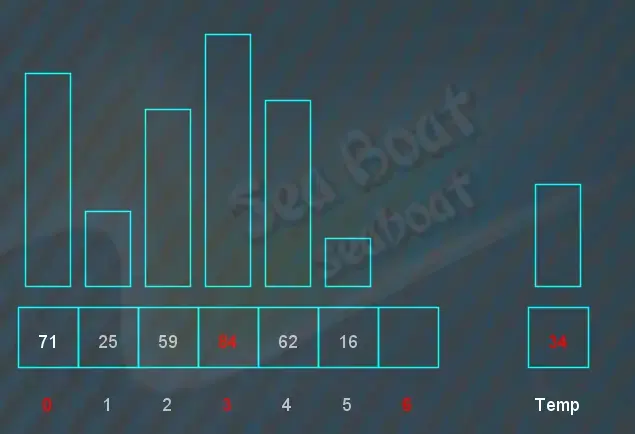 第一轮选取所有元素数量的一半作为增量,即7/2,取3,所以第一轮增量为3,那么第一组分组就是索引为0,3,6对应的元素,即84,71,34,对其进行插入排序操作,