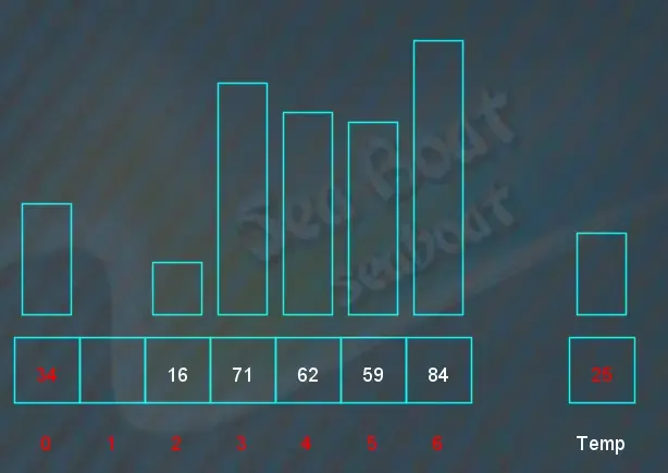 第二轮增量为上一轮增量的二分之一,即3/2,取1,所以第二轮增量为1,此时所有元素组成同一个分组,对该组进行插入排序操作,首先将34当成已排序序列,准备将25插入到已排序序列,