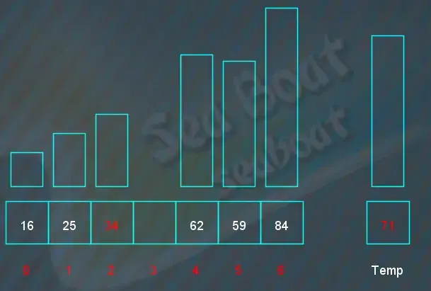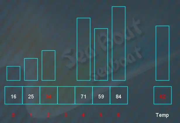 34小于71,所以71后移,34放进去。然后开始处理第二组分组,第二组分组就是索引为1,4对应的元素,即25,62,对其进行插入排序操作,