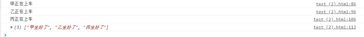 司机在等人上车,在乘客都坐稳了以后开车发车,这就用Promise.all来执行,all接收一个数组参数,里面的值最终都算返回Promise对象。这样,三个异步操作的并行执行的,等到它们都执行完后才会进到then里面。那么,三个异步操作返回的数据哪里去了呢?都在then里面呢,all会把所有异步操作的结果放进一个数组中传给then,就是上面的results。所以上面代码的输出结果就是: