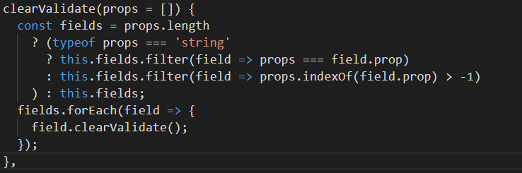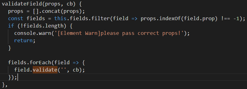 6.validateField(),对部分表单字段进行校验的方法。如下图所示,从全部校验项中筛选出传入的需要校验的项,如果没有,则返回错误提示;如果校验项存在,则遍历调用对应项的validate方法,每一个校验项都会调用对应的cb方法;