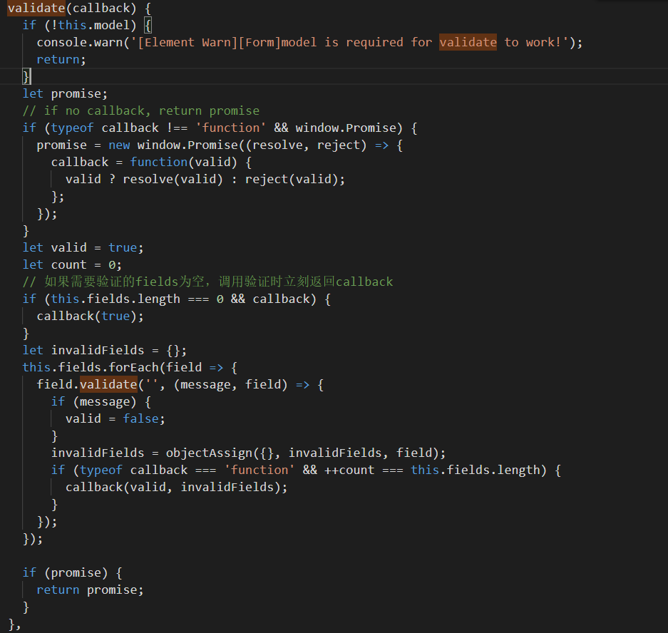 5.validate(),对整个表单进行校验;传入回调函数,校验完成执行回调函数,传入其他参数或者不传入,则返回promise; j进入到validate()函数中,如下图所示:首先是如果form没有绑定数据,则返回错误提示,接下来如果传入的参数不是函数,则调用window.Promise,将callback变成一个函数,如果没有需要验证的formItem,返回callback(true);如果有需要验证的formItem,则循环调用对应formItem的validate()方法,将未通过校验的项放入invalidFields对象中,当所有项的验证都完成后,调用callback函数,将验证结果和验证未通过的项放入回调函数中。如果传入的参数不是函数,则将返回promise函数,参数为验证结果,不包含未通过验证的项。