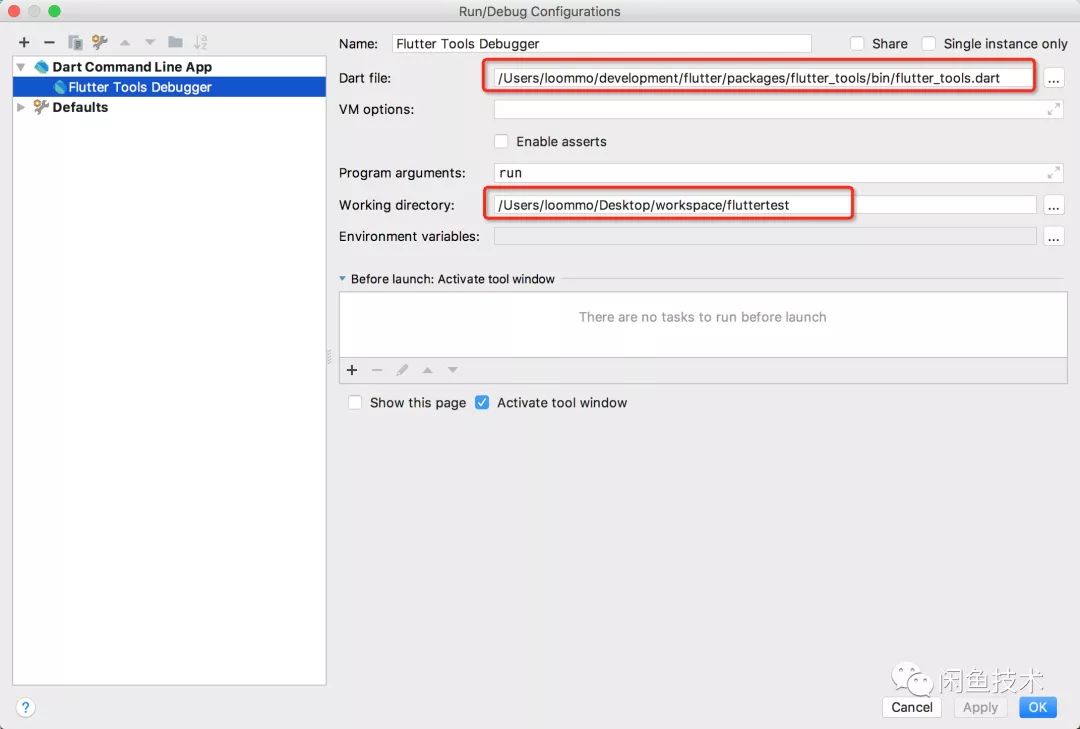 添加新的Debug Configurations,woking directory设置为fluttertest项目地址