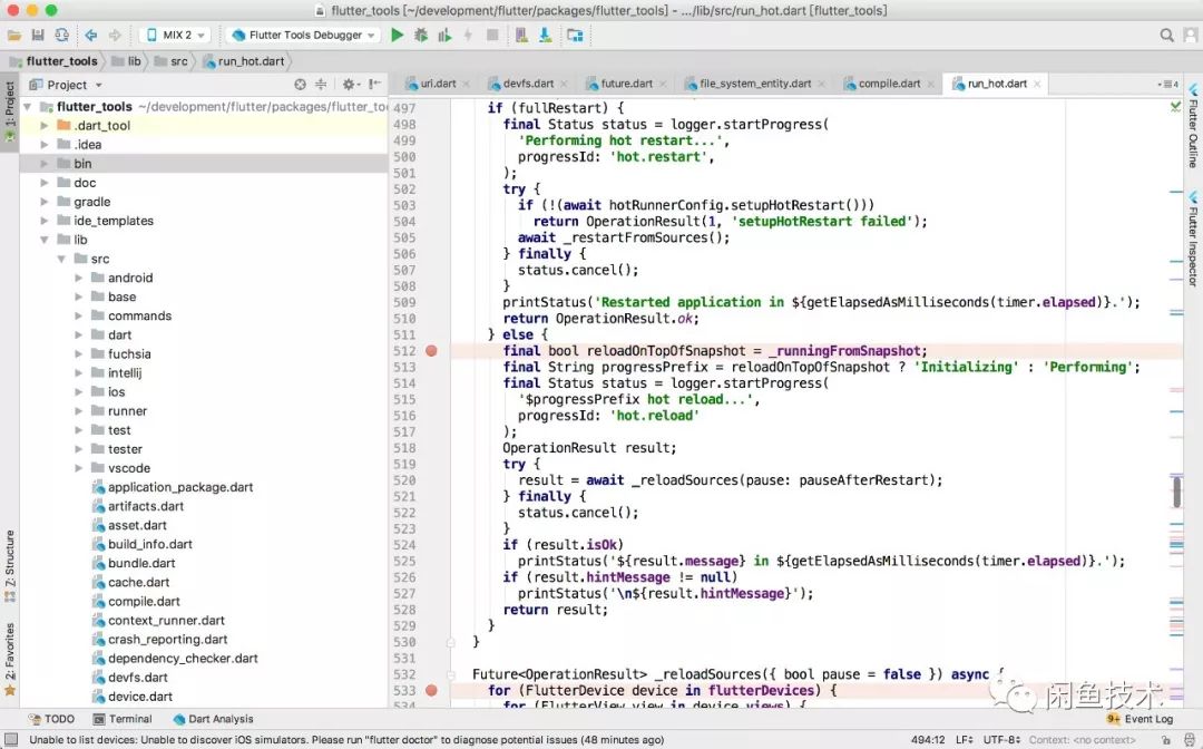使用AndroidStudio打开fluttertools(/flutter/packages/fluttertools),断点设置为HotRunner.restart()方法