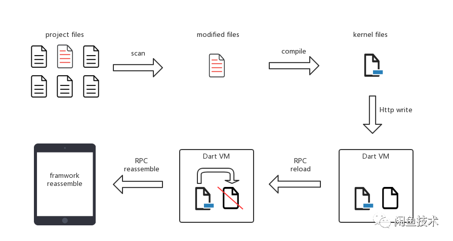 首先_updateDevFS()会将工程中文件逐一扫描,检查是否有删除、新增或者改动,扫描完成后,生成kernel files,命名为app.dill.incremental.dill文件,通过HTTP端口发送给DartVM;