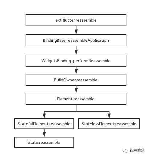 BindingBase.reassembleApplication-> WidgetsBinding. performReassemble -> BuildOwner.reassemble -> Element.reassemble 。