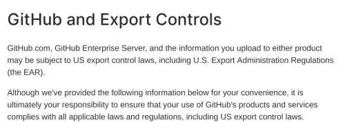 GitHub.com, GitHub Enterprise Server, and the information you upload to either product may be subject to US export control laws, including U.S. Export Administration Regulations (the EAR).