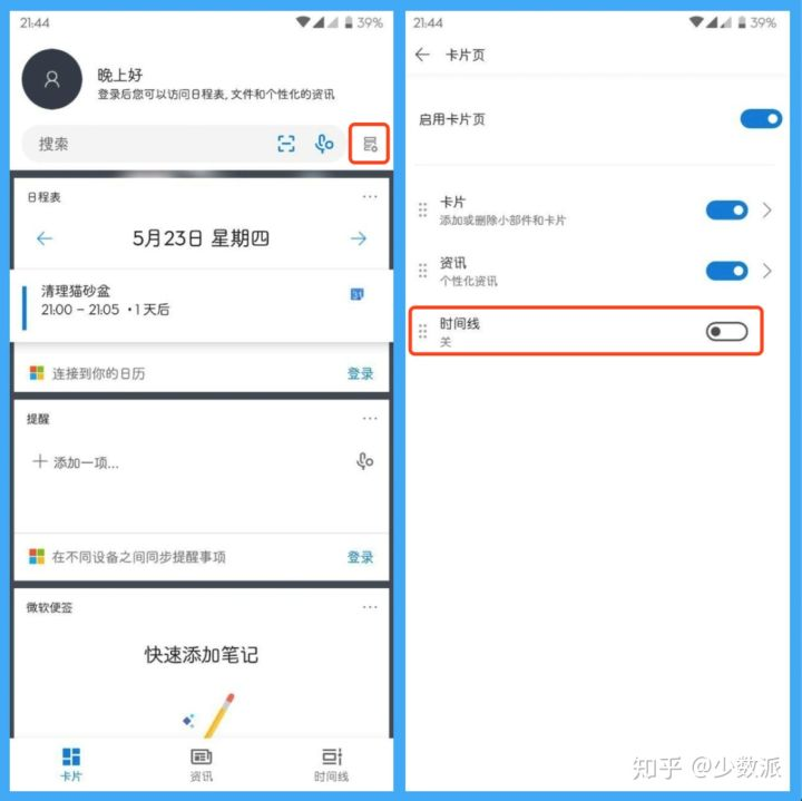 而在右上角的设定按钮里,我们可以根据自己的喜好和实际情况来控制负一屏所显示的内容,自由关闭不想使用的功能:如果你不是一个微软账号的使用者,你可以关掉与 Windows 10 多任务整合的「时间线」功能来避免多余项目。