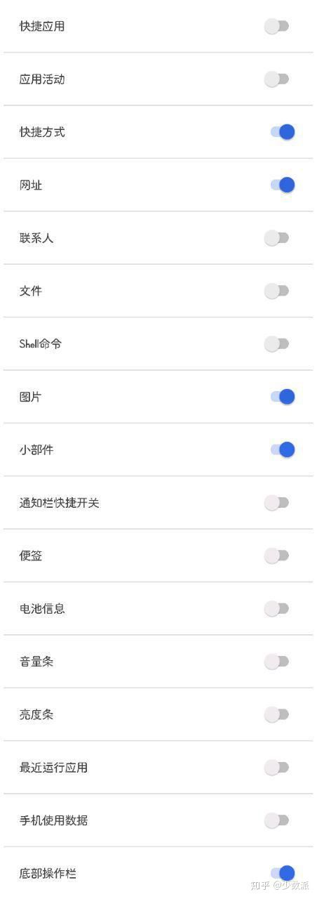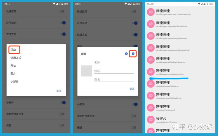 第四栏的「快捷应用」中则用于存放经常使用的几个应用(少数派肯定是必备的)。而在这之后的一栏才是全局负一屏的重点功能——应用活动,应用活动能通过直接调用手机里应用的包名或类名来启动应用的功能,通过这种方式,就能把你在应用中常常使用的功能直接抽离出来做成单独快捷方式,比如你可以找到到哔哩哔哩的热门榜功能并将其固定在此处,这样一来热榜就能一触直达了。