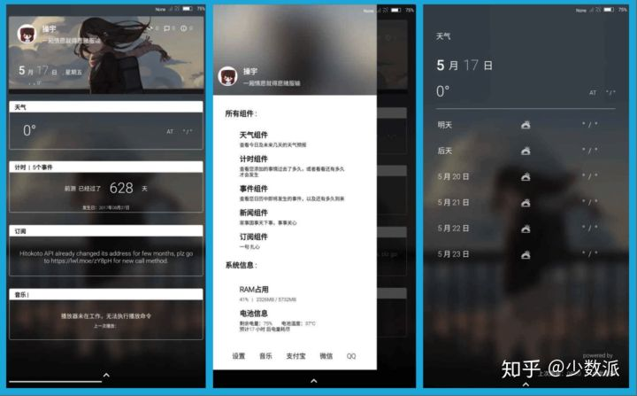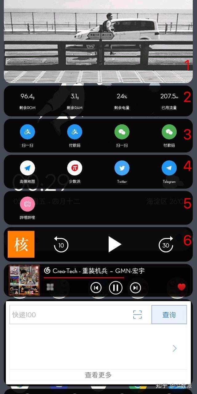 同时,我们也可以在卡片功能区域内添加应用微件,更高效地进行一些便捷操作。譬如我就添加了音乐、博客、快递查询和知乎搜索的小部件,方便日常操作和信息检索。