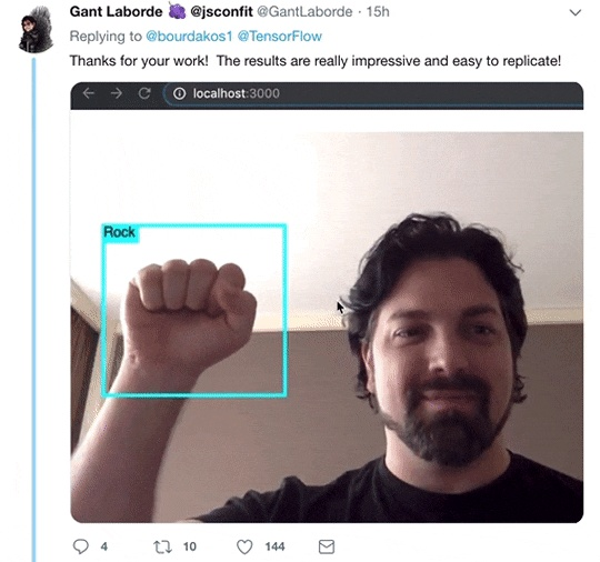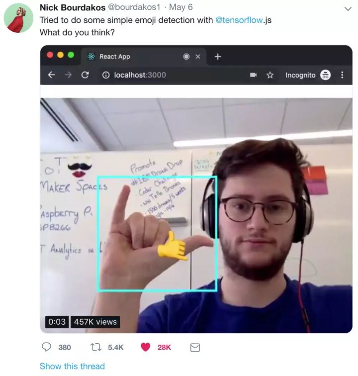 尼克用的是TensorFlow.js,实时识别毫无压力。