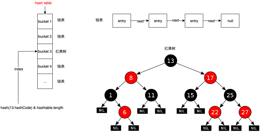 hash table 本质上是一个数组 + 链表或红黑树的数据结构, hash table 通过建立 hash 到数据节点的映射关系,巧妙的达成 O(1) 的检索效率。其中每个链表保存着 hash 冲突(key 不相等,hash 值相等)的数据项,默认情况下,当达到 8 个冲突时,链表就会转换成红黑树,转换之后还伴随着 O(n) -> O(log n) 的效率提升,不过这种情况出现的概率很低(在分散的 hash code 的前提下,相同的 hash 值产生 8 次冲突的概率仅为千万分之 6),不过可以通过人为模拟重现这种情况。