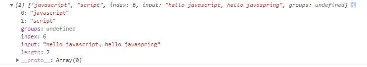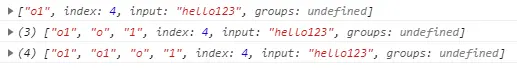 可以看到返回一个数组,数组的第一项为匹配到的结果,第二项为第一个子表达式的匹配结果,如果还有其他子表达式,会依次往后排。同时这个数组对象还有以下几个属性: