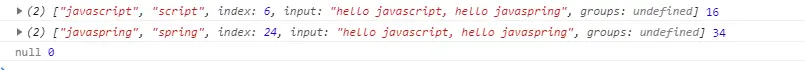 console.log(execResult, reg.lastIndex);从打印结果可以看出,第一次匹配到了字符串javascript,其开始下标为6,实例属性lastIndex为16,即javascript字符串后面的一个字符“逗号”的位置下标。第二次调用的匹配结果为javaspring,lastIndex的值为34。第三次调用没有匹配到任何结果,所以返回了null,其lastIndex的结果也被重置为了0。