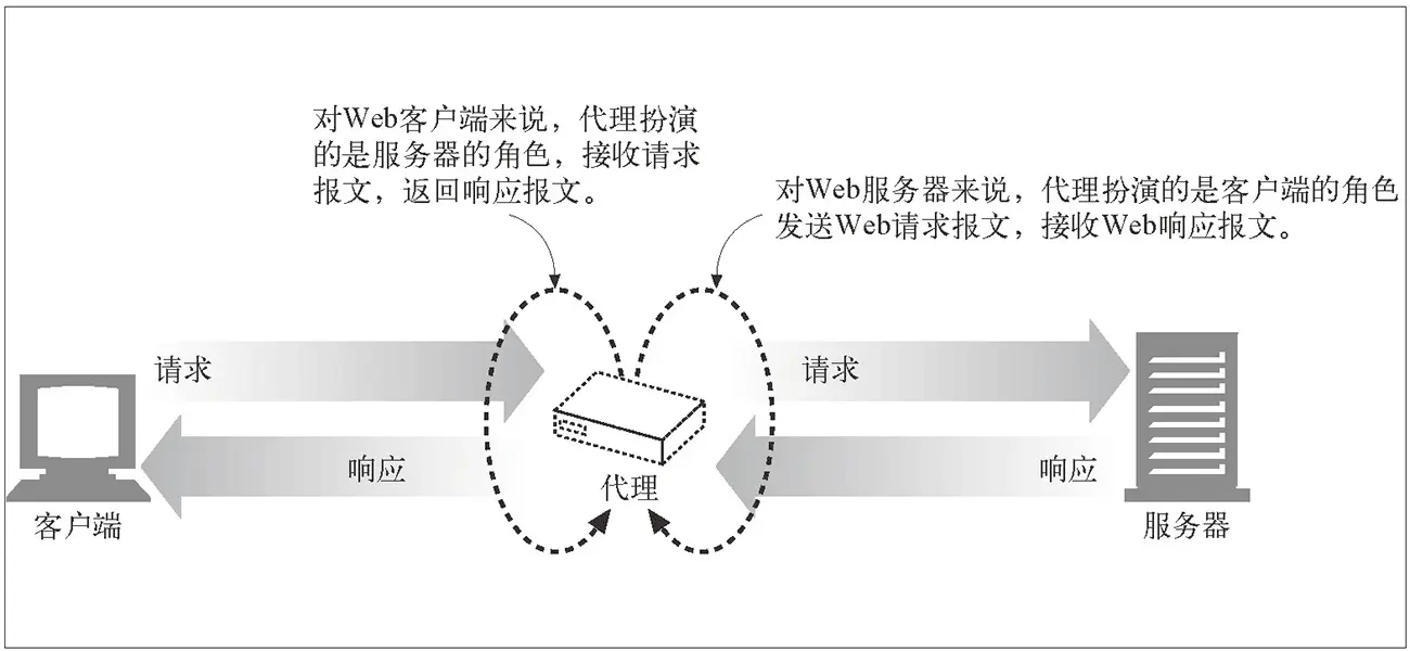 HTTP 客户端向代理发送请求报文,代理服务器需要正确地处理请求和连接(例如正确处理 Connection: keep-alive),同时向服务器发送请求,并将收到的响应转发给客户端。