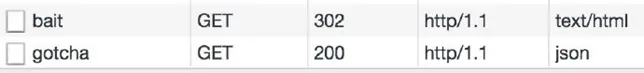 检查网络请求发现,第一个请求 /bait 返回了302,然后发起了第二个请求 /gotcha: