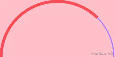 所以,首先对仪表盘进行分解,分解成 canvas能绘制出的基本图形,其主体其实就两个圆弧,一个是底部蓝色的半圆轨道,一个是代表进度的红色圆弧,其实都是圆弧,canvas刚好有绘制圆弧的能力,即: