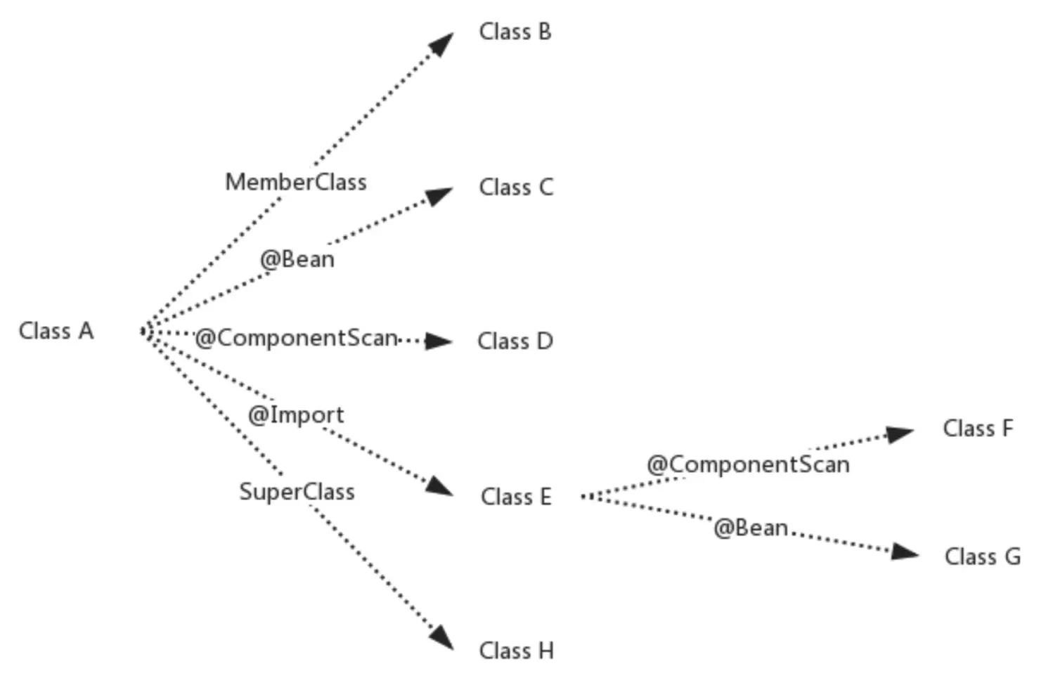 Bean Class的结构图如上所示,A是配置类的入口,通过A能直接或间接的引入一个模块。