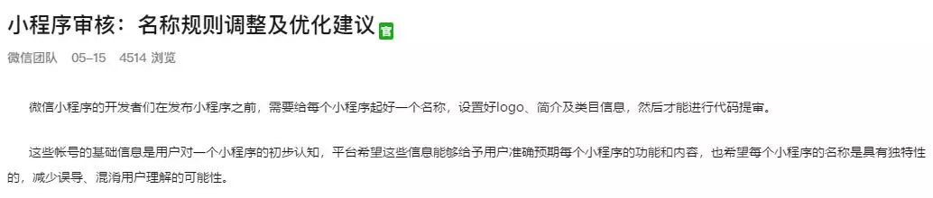 上周,微信开放社区公布了小程序名称规则调整的公告,主要是针对之前一些投机的取名做法罗列了调整和优化建议,调整后的命名规范比之前更加严格。
