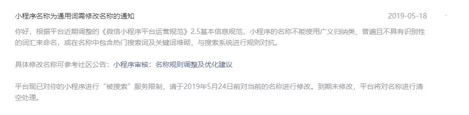 对于调整规范发布前已经通过审核的小程序,开发者也不要掉以轻心,近期平台可能将对名称重新审核,所以请提前自查,做好准备。